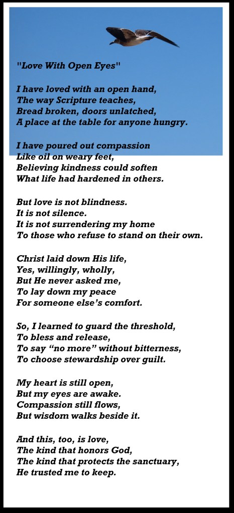 So, I learned to guard the threshold, To bless and release, To say “no more” without bitterness, To choose stewardship over guilt.