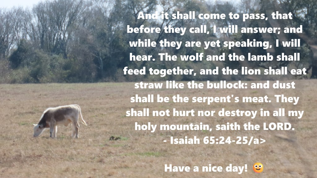 And it shall come to pass, that before they call, I will answer; and while they are yet speaking, I will hear. The wolf and the lamb shall feed together, and the lion shall eat straw like the bullock: and dust shall be the serpent’s meat. They shall not hurt nor destroy in all my holy mountain, saith the LORD.