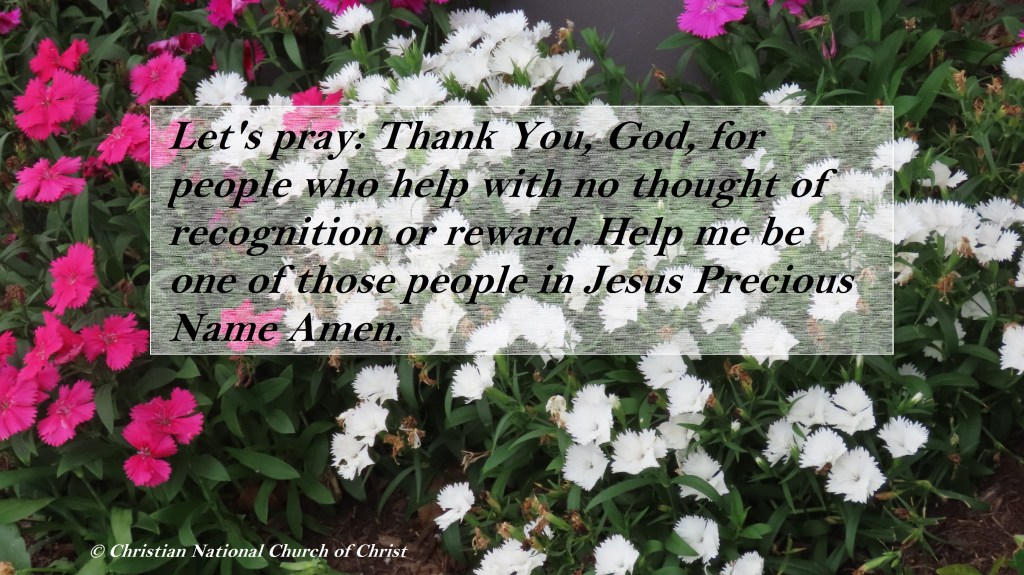 Let’s pray: Thank You, God, for people who help with no thought of recognition or reward. Help me be one of those people in Jesus Precious Name Amen.