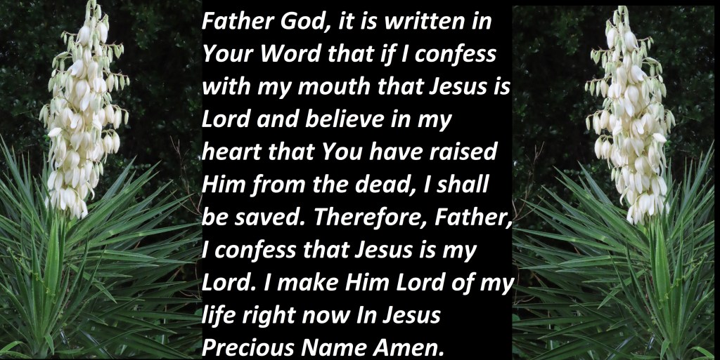 Father God, it is written in Your Word that if I confess with my mouth that Jesus is Lord and believe in my heart that You have raised Him from the dead, I shall be saved. Therefore, Father, I confess that Jesus is my Lord. I make Him Lord of my life right now In Jesus Precious Name Amen.