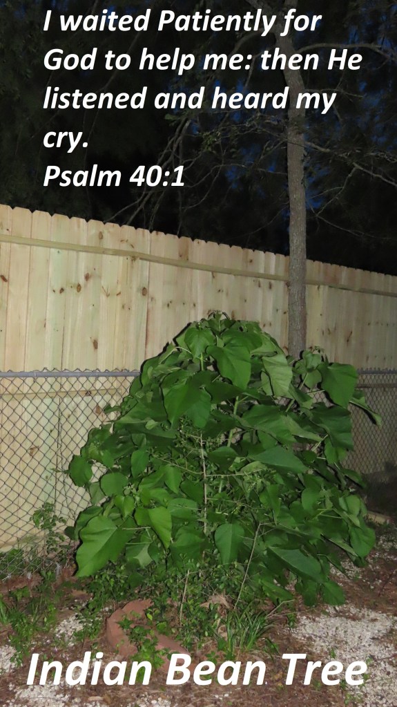 Good morning. Wow! We was at the store yesterday waiting in line to self check out. We walk up to the register to see money coming out of the machine. I grabbed it quick and ran to the man and left it and gave it to him. He thanked me. But as I ran to him I heard this woman yelled! What does she think she is doing? What ever else she said! But it didn’t bother me. So I started thinking when I got in the car riding home. Isn’t that just like people. You live in a big house and everyone thinks. Wow they are rich. Not knowing all the debt that comes with it to make you work harder. We live in a society that thinks big. But if you are in a small house. People think this person has it hard. I say the person who is patient in listening to the little stuff and doing the big stuff matter. Some people thou need common sense in their life. Like instead of judging when a grown man accidently throws the ball over the fence and the people call the police to condemn that man and get him for trespassing. Get to know the person. But if a child throws a ball over the fence the people don’t call the police for trespassing they let the child get the ball. We live in a society that is uncertain. Don’t know one day from the other what is going to happen. But those people who are honorable to God, don’t have to worry. They just have to be patient and not care what this world judges. We have this Indian Bean tree that we had cut down. {Genus Catalpa are deciduous trees of spreading habit, with handsome, large leaves and erect panicles of showy, bell-shaped flowers in late summer, followed by persistent, slender bean-like seed capsules Details C. bignonioides is a spreading medium-sized deciduous tree, with pale green, broad-ovate leaves to 25cm in length.} Well it was so old. That within the past 2 years the big branch’s at different times split right in half and ended up in the neighbors yard so we had to saw the pieces to get it off their property. No one called the police. Well a month ago we paid good money to cut down a few huge trees that died from the winter freeze. So when the tree men was cutting down the Indian tree a branch fell in the yard, but the gate came off the hinges. and the lady next door yelled at them cause they went in her yard just to get the gate back on and she screamed at them like she was being harmed in some way. I told them not to worry. I waited till I saw her leave and me and my son put the gate back on it hinges. I just had to be patient. Well anyways. God is good cause the Indian tree is growing back. Lo! I am going to try and make baby’s trees and put them in plant pots. being patient always pays off. Love your neighbor can sometimes be hard. It is not hard to be patient. God grows all good things in His timing.