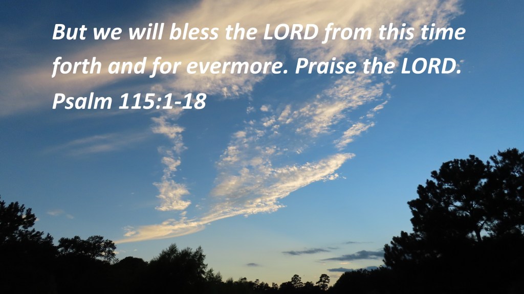 Not unto us, O LORD, not unto us, but unto thy name give glory, for thy mercy, and for thy truth’s sake. Wherefore should the heathen say, Where is now their God? But our God is in the heavens: he hath done whatsoever he hath pleased. Their idols are silver and gold, the work of men’s hands. They have mouths, but they speak not: eyes have they, but they see not: They have ears, but they hear not: noses have they, but they smell not: They have hands, but they handle not: feet have they, but they walk not: neither speak they through their throat. They that make them are like unto them; so is every one that trusteth in them. O Israel, trust thou in the LORD: he is their help and their shield. O house of Aaron, trust in the LORD: he is their help and their shield. Ye that fear the LORD, trust in the LORD: he is their help and their shield. The LORD hath been mindful of us: he will bless us; he will bless the house of Israel; he will bless the house of Aaron. He will bless them that fear the LORD, both small and great. The LORD shall increase you more and more, you and your children. Ye are blessed of the LORD which made heaven and earth. The heaven, even the heavens, are the LORD’s: but the earth hath he given to the children of men. The dead praise not the LORD, neither any that go down into silence. But we will bless the LORD from this time forth and for evermore. Praise the LORD.