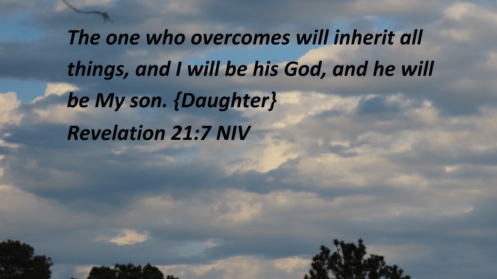 The one who overcomes will inherit all things, and I will be his God, and he will be My son. {Daughter}