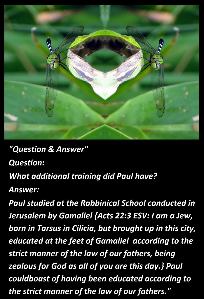 Paul studied at the Rabbinical School conducted in Jerusalem by Gamaliel {Acts 22:3 ESV: I am a Jew, born in Tarsus in Cilicia, but brought up in this city, educated at the feet of Gamaliel according to the strict manner of the law of our fathers, being zealous for God as all of you are this day.} Paul couldboast of having been educated according to the strict manner of the law of our fathers.”