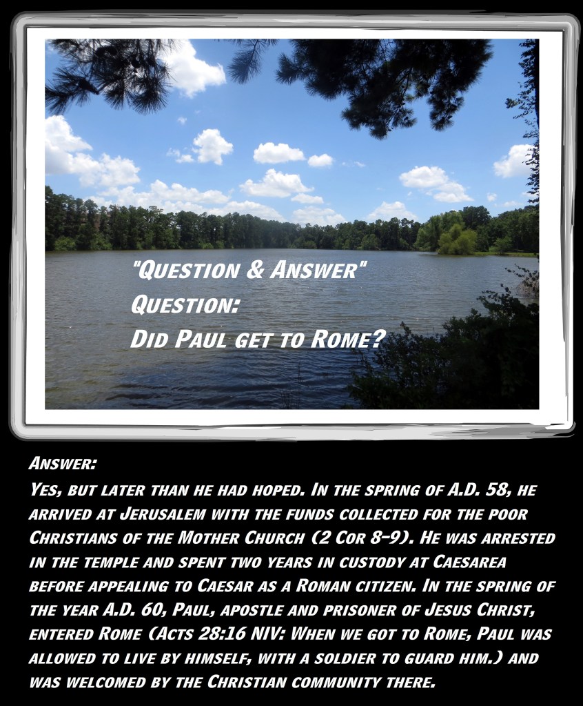 Yes, but later than he had hoped. In the spring of A.D. 58, he arrived at Jerusalem with the funds collected for the poor Christians of the Mother Church (2 Cor 8–9). He was arrested in the temple and spent two years in custody at Caesarea before appealing to Caesar as a Roman citizen. In the spring of the year A.D. 60, Paul, apostle and prisoner of Jesus Christ, entered Rome (Acts 28:16 NIV: When we got to Rome, Paul was allowed to live by himself, with a soldier to guard him.) and was welcomed by the Christian community there.
