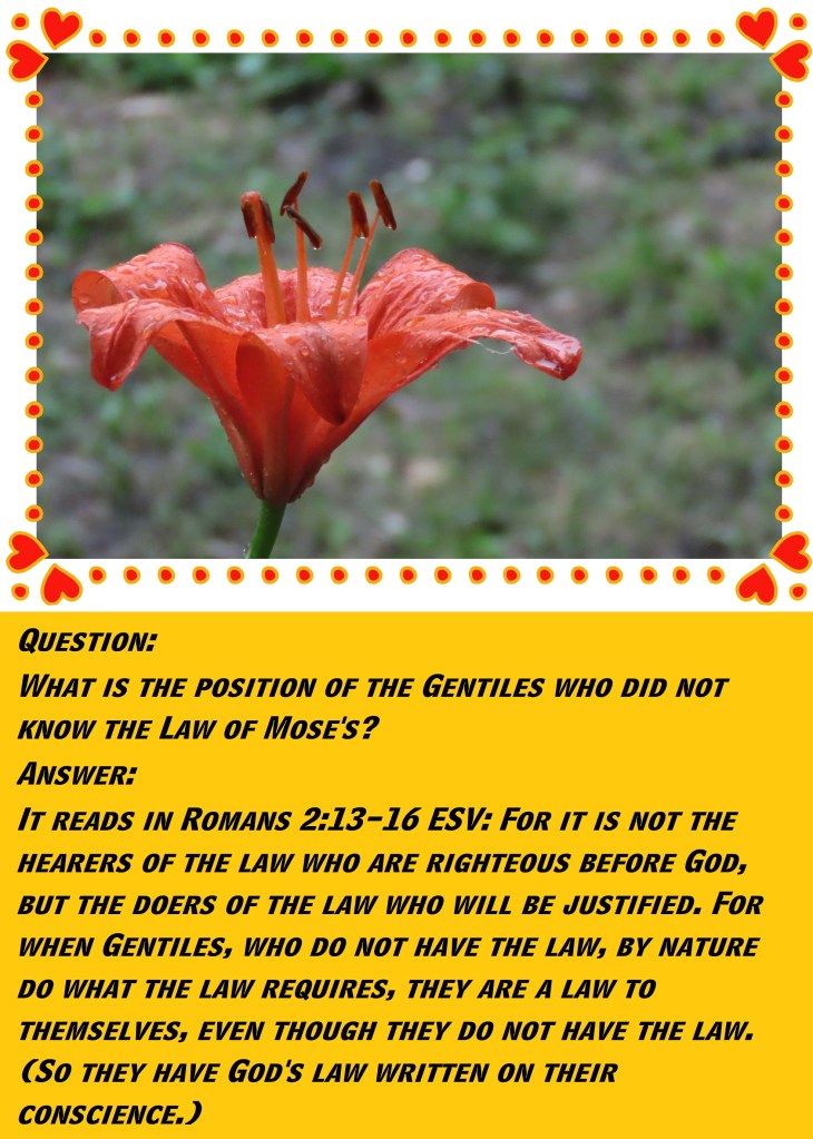 It reads in Romans 2:13-16 ESV: For it is not the hearers of the law who are righteous before God, but the doers of the law who will be justified. For when Gentiles, who do not have the law, by nature do what the law requires, they are a law to themselves, even though they do not have the law. (So, they have God’s law written on their conscience.)