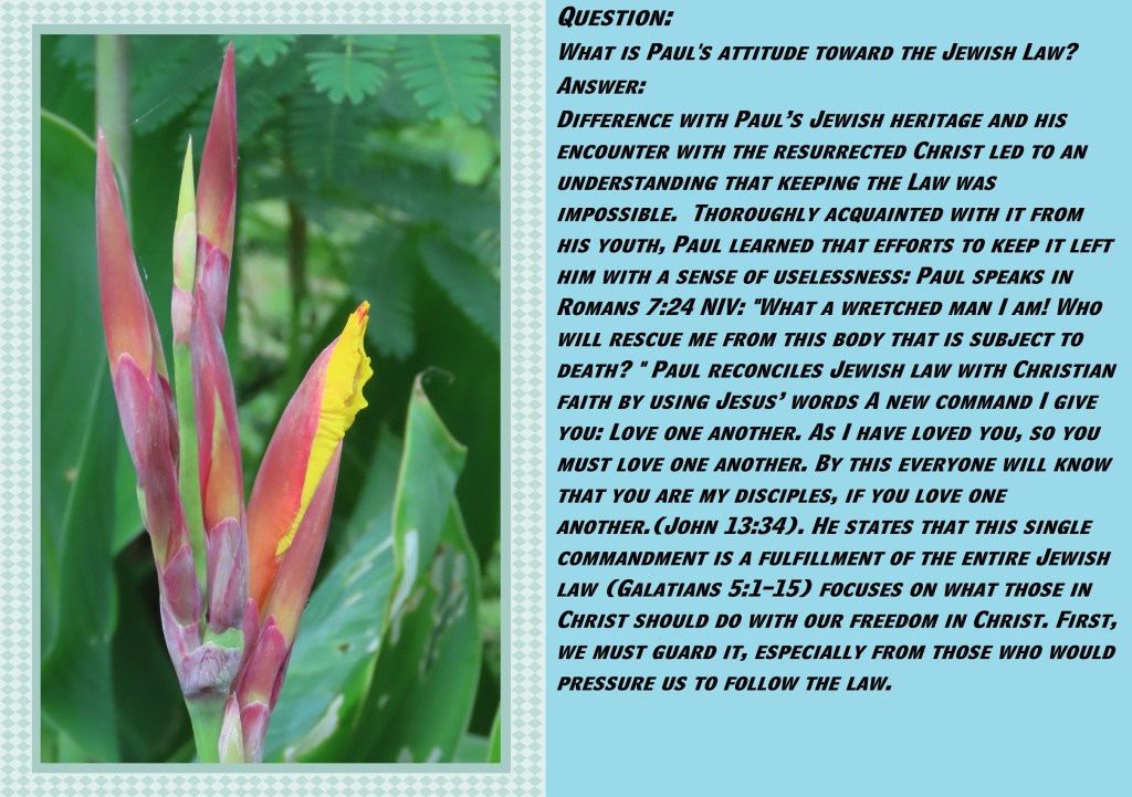 Difference with Paul’s Jewish heritage and his encounter with the resurrected Christ led to an understanding that keeping the Law was impossible. Thoroughly acquainted with it from his youth, Paul learned that efforts to keep it left him with a sense of uselessness: Paul speaks in Romans 7:24 NIV: “What a wretched man I am! Who will rescue me from this body that is subject to death? ” Paul reconciles Jewish law with Christian faith by using Jesus’ words ““A new command I give you: Love one another. As I have loved you, so you must love one another. By this everyone will know that you are my disciples, if you love one another.” (John 13:34). He states that this single commandment is a fulfillment of the entire Jewish law (Galatians 5:1–15) focuses on what those in Christ should do with our freedom in Christ. First, we must guard it, especially from those who would pressure us to follow the law.