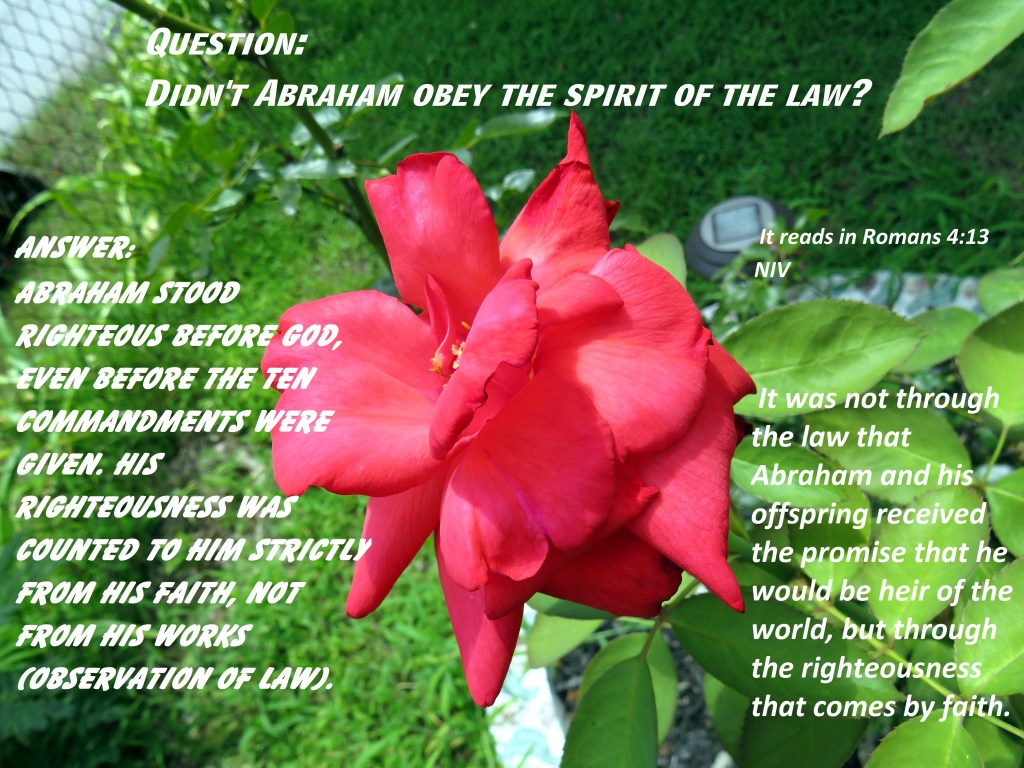 Abraham stood righteous before God, even before the Ten Commandments were given. His righteousness was counted to him strictly from his faith, not from his works (observation of law). It reads in Romans 4:13 NIV