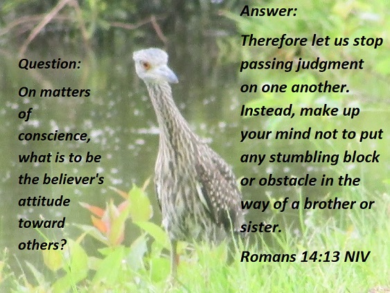 Therefore let us stop passing judgment on one another. Instead, make up your mind not to put any stumbling block or obstacle in the way of a brother or sister.