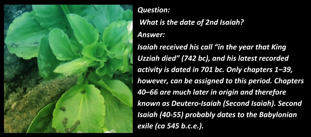 Isaiah received his call “in the year that King Uzziah died” (742 B.C.), and his latest recorded activity is dated in 701 B.C. Only chapters 1–39, however, can be assigned to this period. Chapters 40–66 are much later in origin and therefore known as Deutero-Isaiah (Second Isaiah). Second Isaiah (40-55) probably dates to the Babylonian exile (ca 545 B.C.E.). (549-537B.C.)