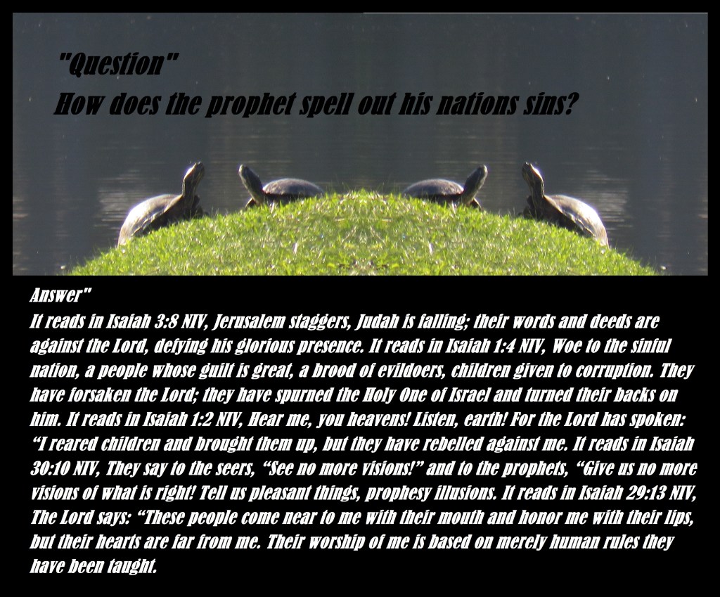 It reads in Isaiah 3:8 NIV, Jerusalem staggers, Judah is falling; their words and deeds are against the Lord, defying his glorious presence. It reads in Isaiah 1:4 NIV, Woe to the sinful nation, a people whose guilt is great, a brood of evildoers, children given to corruption. They have forsaken the Lord; they have spurned the Holy One of Israel and turned their backs on him. It reads in Isaiah 1:2 NIV, Hear me, you heavens! Listen, earth! For the Lord has spoken: “I reared children and brought them up, but they have rebelled against me. It reads in Isaiah 30:10 NIV, They say to the seers, “See no more visions!” and to the prophets, “Give us no more visions of what is right! Tell us pleasant things, prophesy illusions. It reads in Isaiah 29:13 NIV, The Lord says: “These people come near to me with their mouth and honor me with their lips, but their hearts are far from me. Their worship of me is based on merely human rules they have been taught.