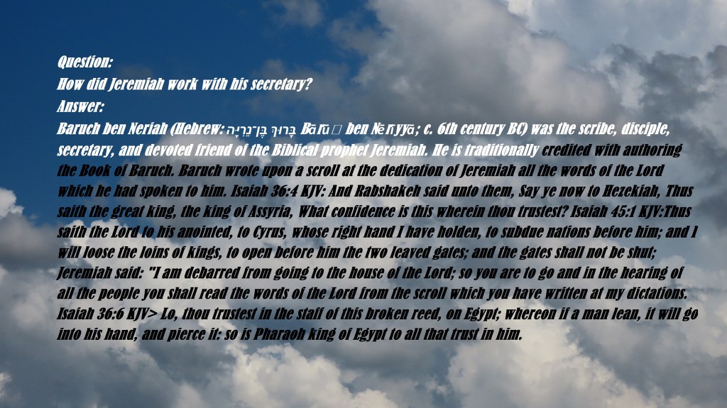 Baruch ben Neriah (Hebrew: בָּרוּךְ בֶּן־נֵרִיָּה Bārūḵ ben Nērīyyā; c. 6th century BC) was the scribe, disciple, secretary, and devoted friend of the Biblical prophet Jeremiah. He is traditionally credited with authoring the Book of Baruch. Baruch wrote upon a scroll at the dedication of Jeremiah all the words of the Lord which he had spoken to him. Isaiah 36:4 KJV: And Rabshakeh said unto them, Say ye now to Hezekiah, Thus saith the great king, the king of Assyria, What confidence is this wherein thou trustest? Isaiah 45:1 KJV:Thus saith the Lord to his anointed, to Cyrus, whose right hand I have holden, to subdue nations before him; and I will loose the loins of kings, to open before him the two leaved gates; and the gates shall not be shut; Jeremiah said: “I am debarred from going to the house of the Lord; so you are to go and in the hearing of all the people you shall read the words of the Lord from the scroll which you have written at my dictations. Isaiah 36:6 KJV> Lo, thou trustest in the staff of this broken reed, on Egypt; whereon if a man lean, it will go into his hand, and pierce it: so is Pharaoh king of Egypt to all that trust in him.
