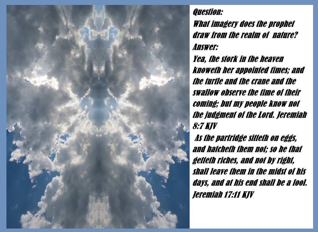 Yea, the stork in the heaven knoweth her appointed times; and the turtle and the crane and the swallow observe the time of their coming; but my people know not the judgment of the Lord. Jeremiah 8:7 KJV