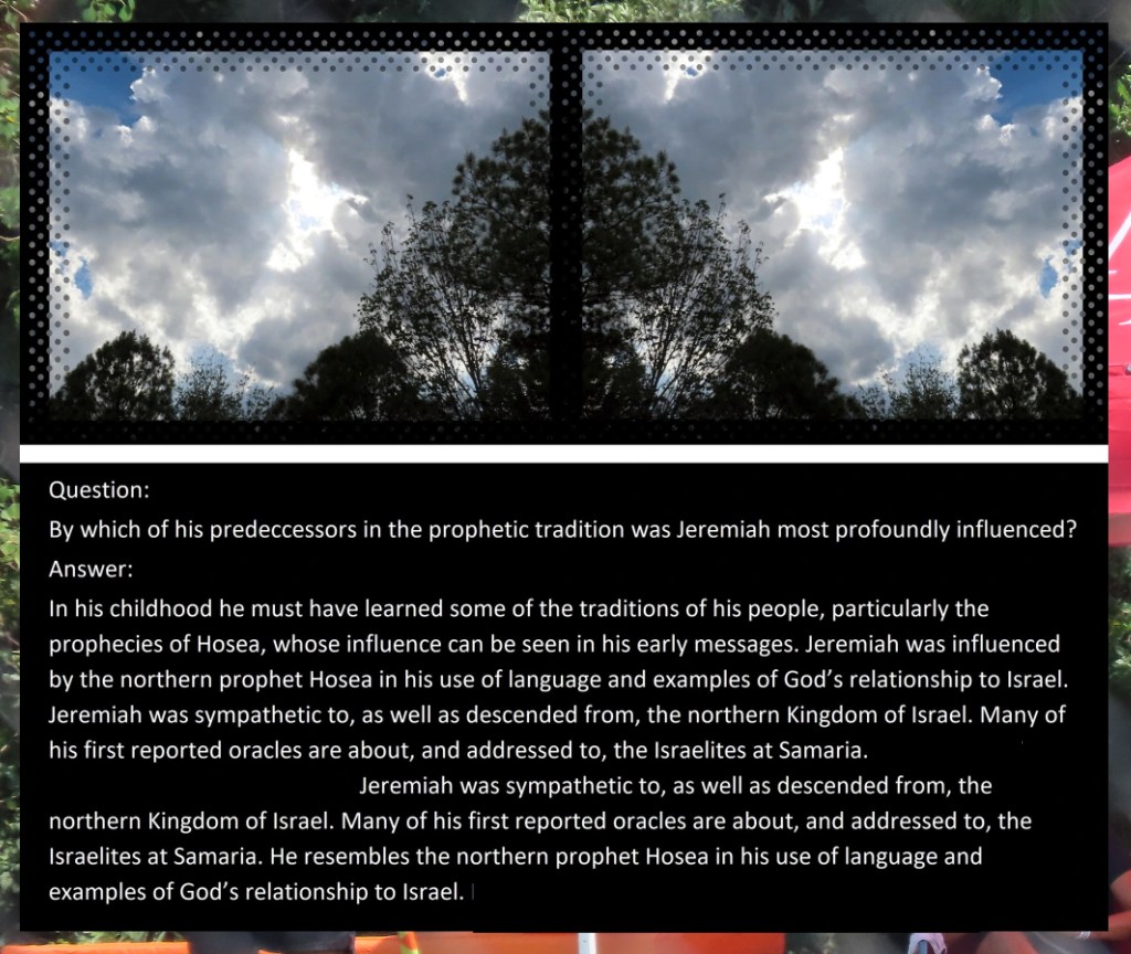 In his childhood, he must have learned some of the traditions of his people, particularly the prophecies of Hosea, whose influence can be seen in his early messages. Jeremiah was influenced by the northern prophet Hosea in his use of language and examples of God’s relationship to Israel. Jeremiah was sympathetic to, as well as descended from, the northern Kingdom of Israel. Many of his first reported oracles are about and addressed to, the Israelites at Samaria.