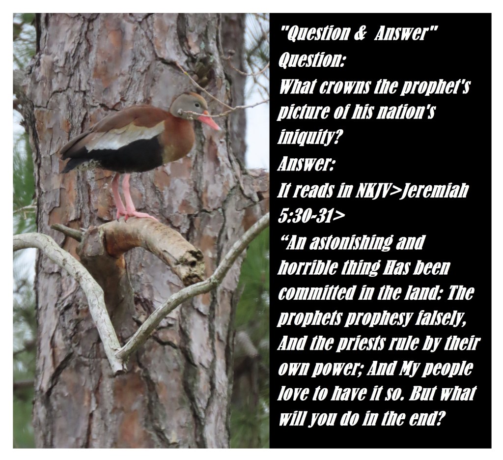 “An astonishing and horrible thing Has been committed in the land: The prophets prophesy falsely, And the priests rule by their own power, And My people love to have it so. But what will you do in the end?