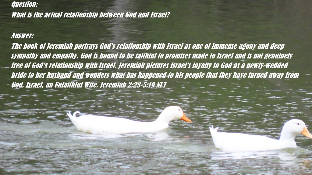 The book of Jeremiah portrays God’s relationship with Israel as one of immense agony and deep sympathy and empathy. God is bound to be faithful to promises made to Israel and is not genuinely free of God’s relationship with Israel. Jeremiah pictures Israel’s loyalty to God as a newly-wedded bride to her husband and wonders what has happened to his people that they have turned away from God. Israel, an Unfaithful Wife. Jeremiah 2:23-5:19 NLT