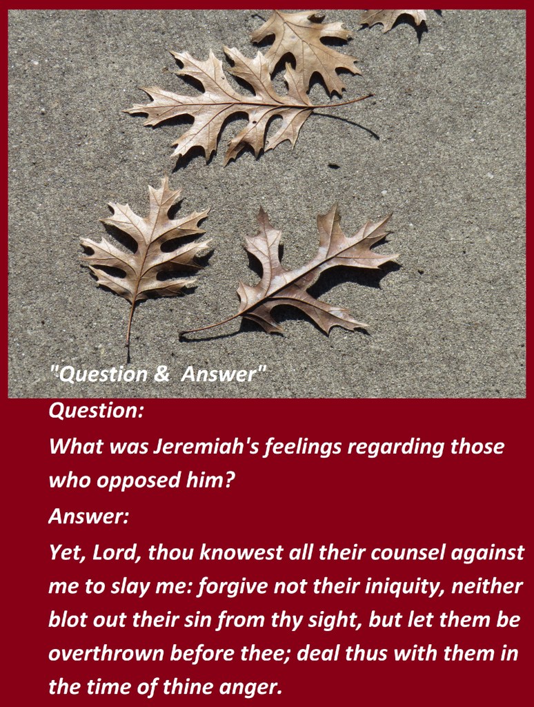 Yet, Lord, thou knowest all their counsel against me to slay me: forgive not their iniquity, neither blot out their sin from thy sight, but let them be overthrown before thee; deal thus with them in the time of thine anger.