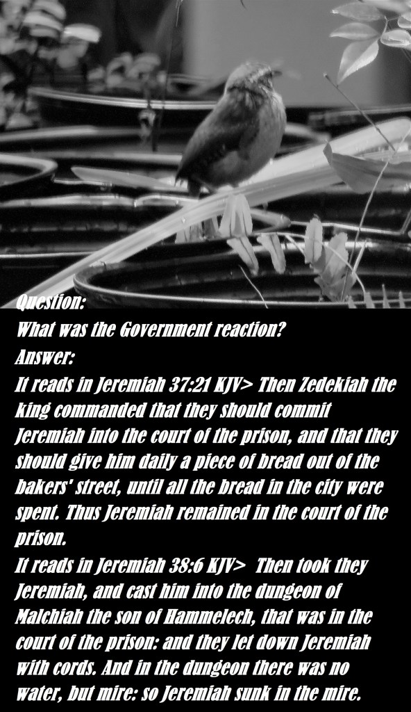 It reads in Jeremiah 37:21 KJV> Then Zedekiah the king commanded that they should commit Jeremiah into the court of the prison and that they should give him daily a piece of bread out of the bakers’ street until all the bread in the city were spent. Thus Jeremiah remained in the court of the prison.
