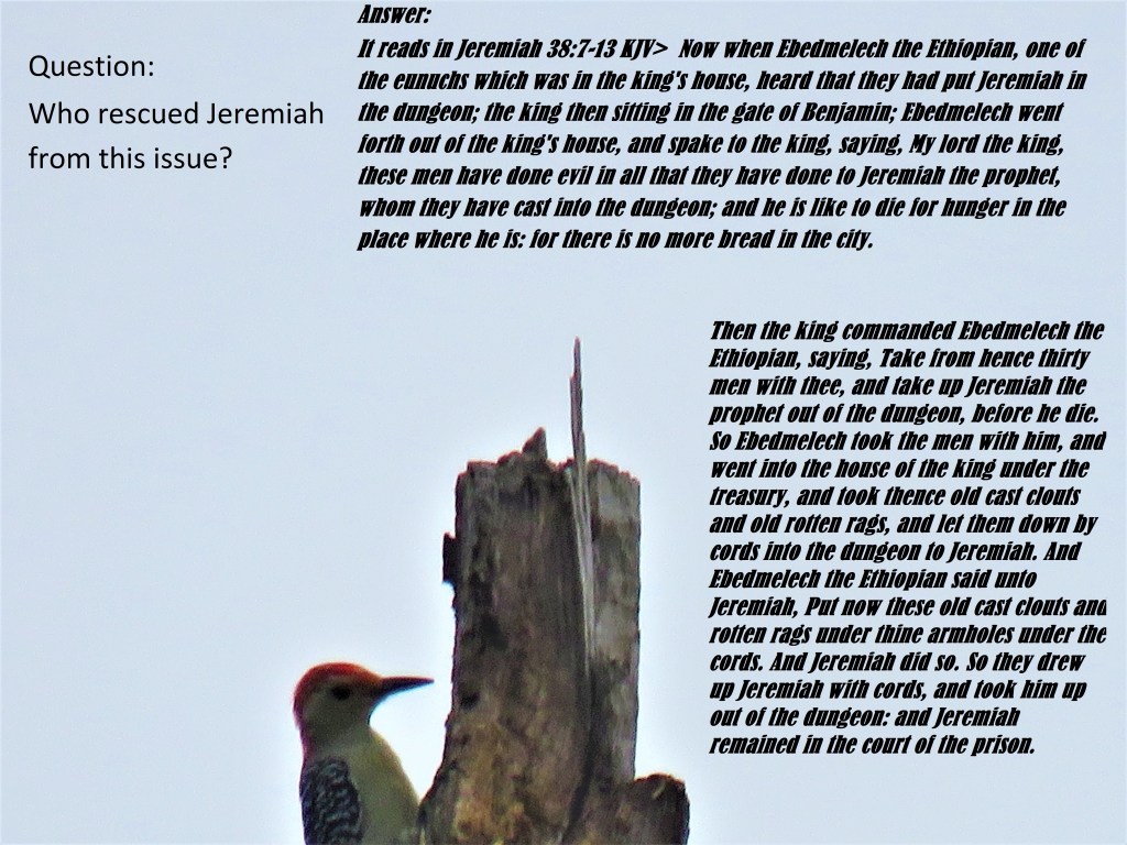 It reads in Jeremiah 38:7-13 KJV> Now when Ebedmelech the Ethiopian, one of the eunuchs which was in the king’s house, heard that they had put Jeremiah in the dungeon; the king then sitting in the gate of Benjamin; Ebedmelech went forth out of the king’s house, and spake to the king, saying, My lord the king, these men have done evil in all that they have done to Jeremiah the prophet, whom they have cast into the dungeon; and he is like to die for hunger in the place where he is: for there is no more bread in the city. Then the king commanded Ebedmelech the Ethiopian, saying, Take from hence thirty men with thee, and take up Jeremiah the prophet out of the dungeon before he dies. So Ebedmelech took the men with him and went into the house of the king under the treasury, and took thence old cast clouts and old rotten rags, and let them down by cords into the dungeon to Jeremiah. And Ebedmelech the Ethiopian said unto Jeremiah, Put now these old cast clouts and rotten rags under thine armholes under the cords. And Jeremiah did so. So they drew up Jeremiah with cords, and took him up out of the dungeon: and Jeremiah remained in the court of the prison.