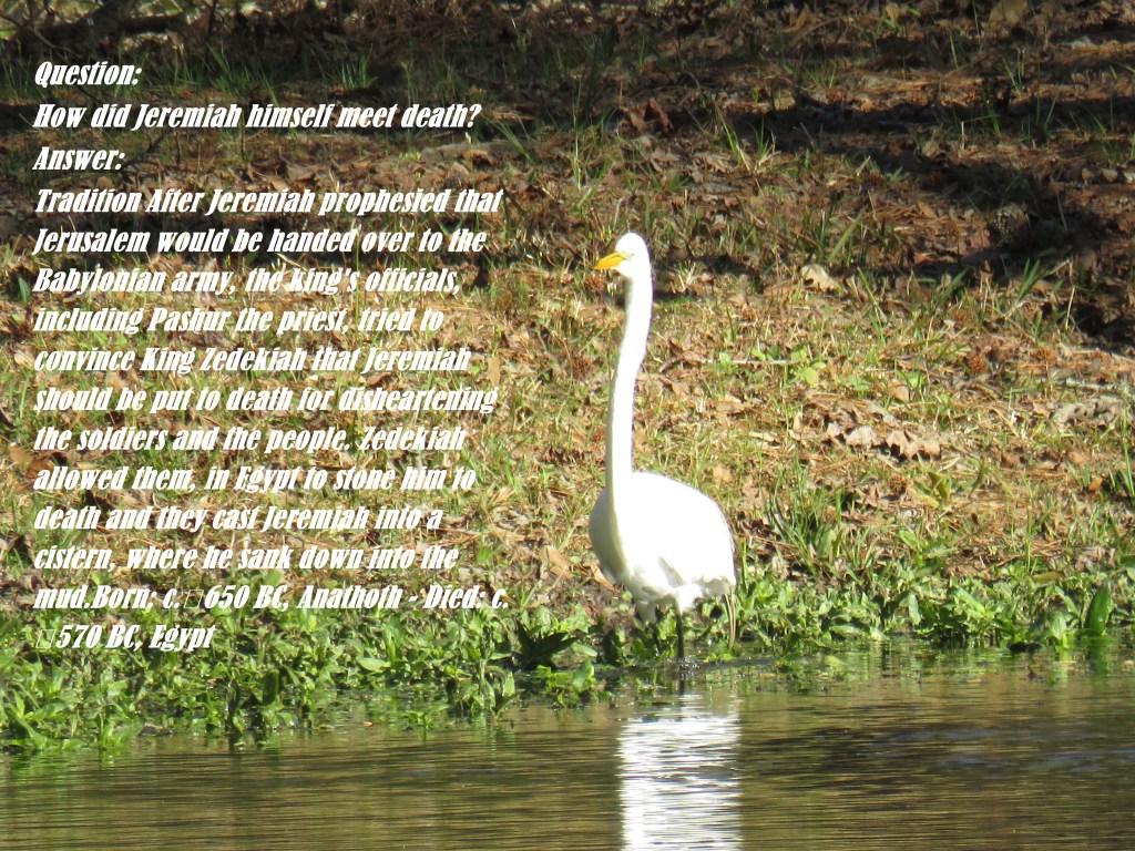 Tradition After Jeremiah prophesied that Jerusalem would be handed over to the Babylonian army, the king’s officials, including Pashur the priest, tried to convince King Zedekiah that Jeremiah should be put to death for disheartening the soldiers and the people. Zedekiah allowed them, in Egypt to stone him to death and they cast Jeremiah into a cistern, where he sank down into the mud. Born: c. 650 BC, Anathoth – Died: c. 570 BC, Egypt.
