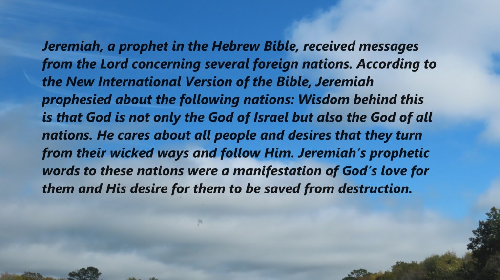 Jeremiah, a prophet in the Hebrew Bible, received messages from the Lord concerning several foreign nations. According to the New International Version of the Bible, Jeremiah prophesied about the following nations: Wisdom behind this is that God is not only the God of Israel but also the God of all nations. He cares about all people and desires that they turn from their wicked ways and follow Him. Jeremiah’s prophetic words to these nations were a manifestation of God’s love for them and His desire for them to be saved from destruction.