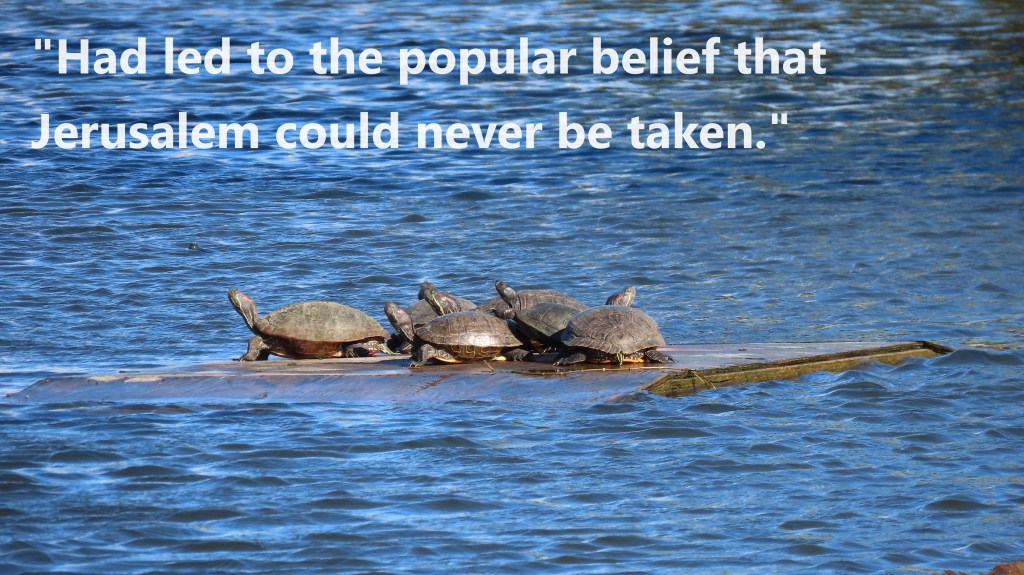 Perhaps the deliverance described in 2 Kings 18:13-19 NIV> In the fourteenth year of King Hezekiah’s reign, Sennacherib king of Assyria attacked all the fortified cities of Judah and captured them. So Hezekiah king of Judah sent this message to the king of Assyria at Lachish: “I have done wrong. Withdraw from me, and I will pay whatever you demand of me.” The king of Assyria exacted from Hezekiah king of Judah three hundred talents of silver and thirty talents of gold. So Hezekiah gave him all the silver that was found in the temple of the Lord and in the treasuries of the royal palace. At this time Hezekiah king of Judah stripped off the gold with which he had covered the doors and doorposts of the temple of the Lord, and gave it to the king of Assyria. “Sennacherib Threatens Jerusalem” 17-19> The king of Assyria sent his supreme commander, his chief officer and his field commander with a large army, from Lachish to King Hezekiah at Jerusalem. They came up to Jerusalem and stopped at the aqueduct of the Upper Pool, on the road to the Washerman’s Field. They called for the king; and Eliakim son of Hilkiah the palace administrator, Shebna the secretary, and Joah son of Asaph the recorder went out to them. The field commander said to them, “Tell Hezekiah: “‘This is what the great king, the king of Assyria, says: On what are you basing this confidence of yours? and verse 36 & 37> But the people remained silent and said nothing in reply, because the king had commanded, “Do not answer him.” Then Eliakim son of Hilkiah the palace administrator, Shebna the secretary, and Joah son of Asaph the recorder went to Hezekiah, with their clothes torn, and told him what the field commander had said. “ and celebrated in (For the director of music. Of the Sons of Korah. According to alamoth. A song.) Psalm 46:1-11 Easy to Read Version> God is our refuge and strength, an ever-present help in trouble. Therefore we will not fear, though the earth give way and the mountains fall into the heart of the sea, though its waters roar and foam and the mountains quake with their surging. There is a river whose streams make glad the city of God, the holy place where the Most High dwells. God is within her, she will not fall; God will help her at break of day. Nations are in uproar, kingdoms fall; he lifts his voice, the earth melts. The Lord Almighty is with us; the God of Jacob is our fortress. Come and see what the Lord has done, the desolations he has brought on the earth. He makes wars cease to the ends of the earth. He breaks the bow and shatters the spear; he burns the shields with fire. He says, “Be still, and know that I am God; I will be exalted among the nations, I will be exalted in the earth.” The Lord Almighty is with us; the God of Jacob is our fortress. “Had led to the popular belief that Jerusalem could never be taken.”