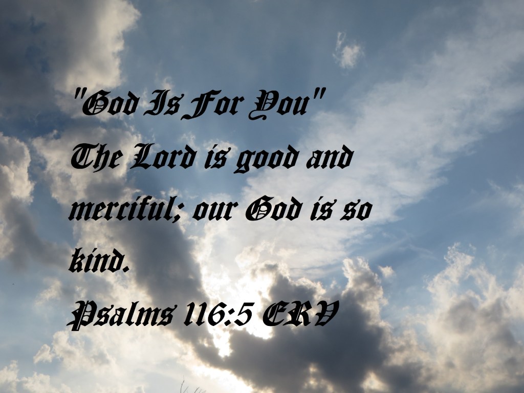 Posted on December 3, 2023December 2, 2023 by © Christian National Church of Christ“God Is For You” The Lord is good and merciful; our God is so kind.Psalms 116:5 ERV Share this: Click to share on X (Opens in new window) X Click to share on Facebook (Opens in new window) Facebook Like Loading... Related