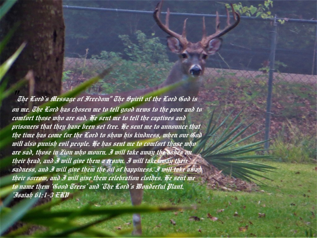“The Lord’s Message of Freedom” The Spirit of the Lord God is on me. The Lord has chosen me to tell good news to the poor and to comfort those who are sad. He sent me to tell the captives and prisoners that they have been set free. He sent me to announce that the time has come for the Lord to show his kindness, when our God will also punish evil people. He has sent me to comfort those who are sad, those in Zion who mourn. I will take away the ashes on their head, and I will give them a crown. I will take away their sadness, and I will give them the oil of happiness. I will take away their sorrow, and I will give them celebration clothes. He sent me to name them ‘Good Trees’ and ‘The Lord’s Wonderful Plant.