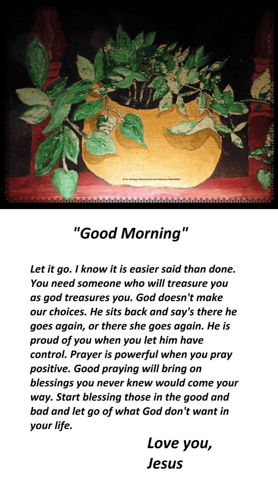 Good morning. Let it go. I know it is easier said than done. You need someone who will treasure you as God treasures you. God doesn’t make our choices. He sits back and say’s there he goes again, or there she goes again. He is proud of you when you let him have control. Prayer is powerful when you pray positive. Good praying will bring on blessings you never knew would come your way. Start blessing those in the good and bad and let go of what God don’t want in your life. Love you Jesus.