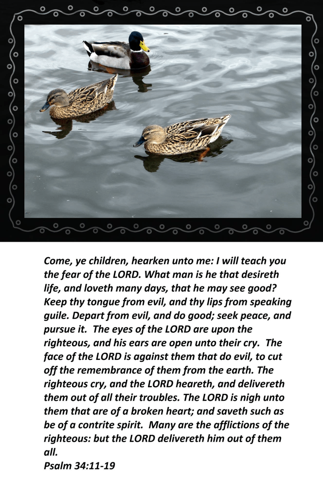 Come, ye children, hearken unto me: I will teach you the fear of the LORD. What man is he that desireth life, and loveth many days, that he may see good? Keep thy tongue from evil, and thy lips from speaking guile. Depart from evil, and do good; seek peace, and pursue it. The eyes of the LORD are upon the righteous, and his ears are open unto their cry. The face of the LORD is against them that do evil, to cut off the remembrance of them from the earth. The righteous cry, and the LORD heareth, and delivereth them out of all their troubles. The LORD is nigh unto them that are of a broken heart; and saveth such as be of a contrite spirit. Many are the afflictions of the righteous: but the LORD delivered him out of them all.
