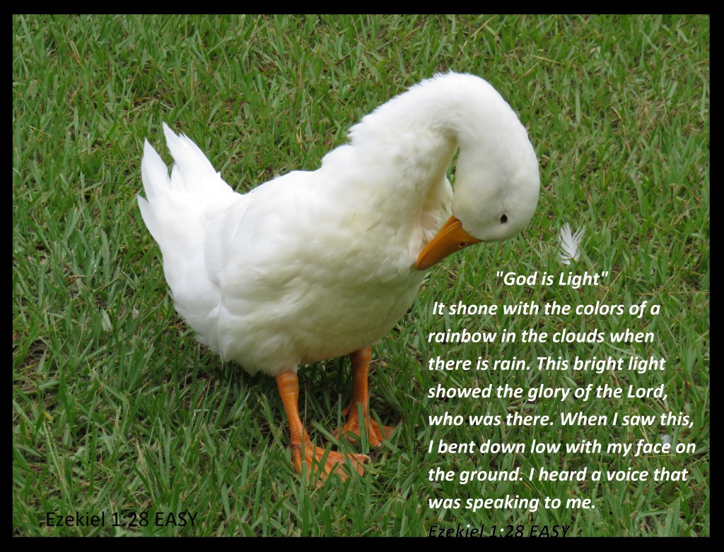 It shone with the colors of a rainbow in the clouds when there is rain. This bright light showed the glory of the Lord, who was there. When I saw this, I bent down low with my face on the ground. I heard a voice that was speaking to me.