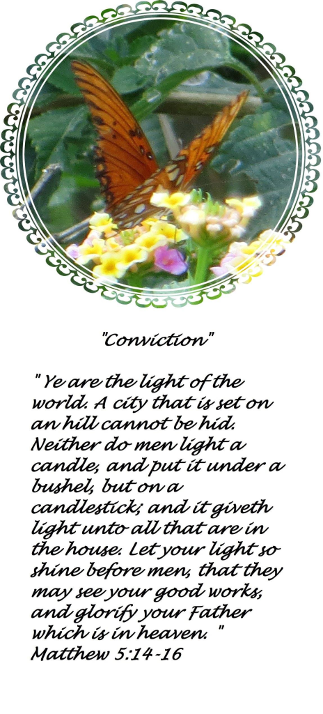 ” Ye are the light of the world. A city that is set on a hill cannot be hidden. Neither do men light a candle, and put it under a bushel, but on a candlestick; and it giveth light unto all that are in the house. Let your light so shine before men, that they may see your good works, and glorify your Father which is in heaven. “