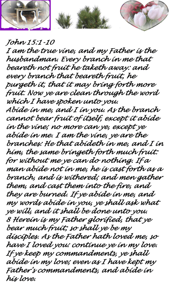 Abide in me, and I in you. As the branch cannot bear fruit of itself, except it abide in the vine; no more can ye, except ye abide in me. I am the vine, ye are the branches: He that abideth in me, and I in him, the same bringeth forth much fruit: for without me ye can do nothing. If a man abides not in me, he is cast forth as a branch, and is withered; and men gather them, and cast them into the fire, and they are burned. If ye abide in me, and my words abide in you, ye shall ask what ye will, and it shall be done unto you. Herein is my Father glorified, that ye bear much fruit; so shall ye be my disciples. As the Father hath loved me, so have I loved you: continue ye in my love. If ye keep my commandments, ye shall abide in my love; even as I have kept my Father’s commandments, and abide in his love.