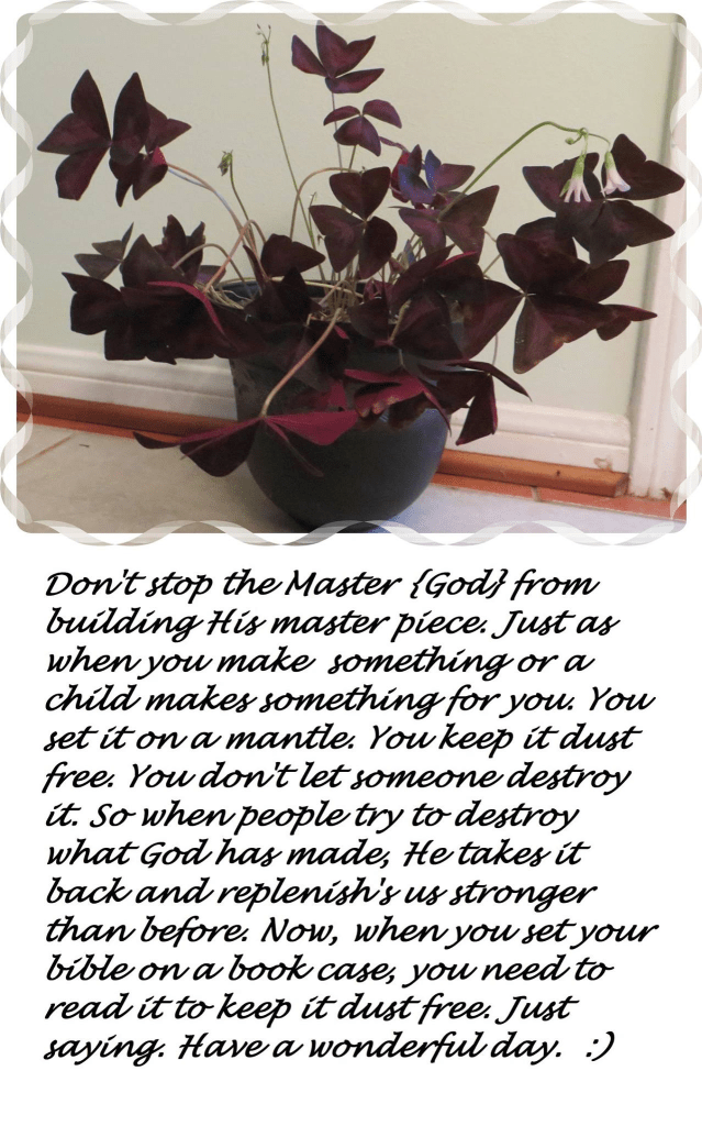 Don’t stop the Master {God} from building His masterpiece. Just as when you make something or a child makes something for you. You set it on a mantle. You keep it dust-free. You don’t let someone destroy it. So when people try to destroy what God has made, He takes it back and replenishes us stronger than before. Now, when you set your bible on a bookcase, you need to read it to keep it dust-free. Just saying. Have a wonderful day.