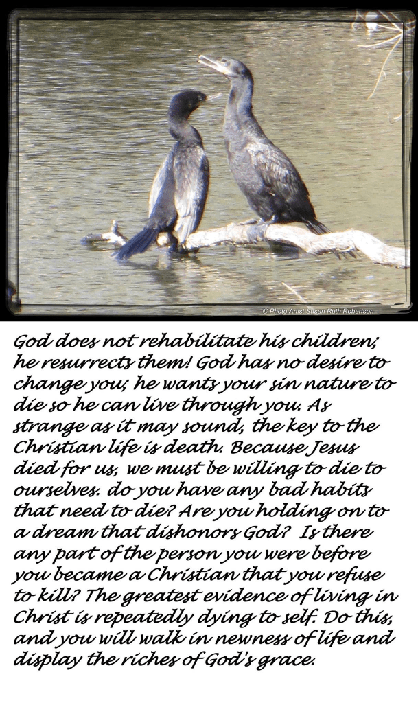 God does not rehabilitate his children; he resurrects them! God has no desire to change you; he wants your sinful nature to die so he can live through you. As strange as it may sound, the key to the Christian life is death. Because Jesus died for us, we must be willing to die for ourselves. Do you have any bad habits that need to die? Are you holding on to a dream that dishonors God? Is there any part of the person you were before you became a Christian that you refuse to kill? The greatest evidence of living in Christ is repeatedly dying to self. Do this, and you will walk in the newness of life and display the riches of God’s grace.