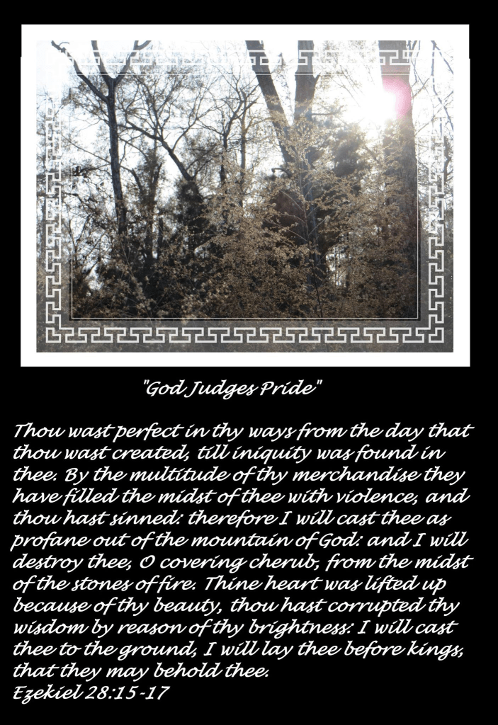 Thou were perfect in thy ways from the day that thou were created, till iniquity was found in thee. By the multitude of thy merchandise, they have filled the midst of thee with violence, and thou hast sinned: therefore, I will cast thee as profane out of the mountain of God: and I will destroy thee, O covering cherub, from the midst of the stones of fire. Thine heart was lifted up because of thy beauty, thou hast corrupted thy wisdom by reason of thy brightness: I will cast thee to the ground, I will lay thee before kings, that they may behold thee.
