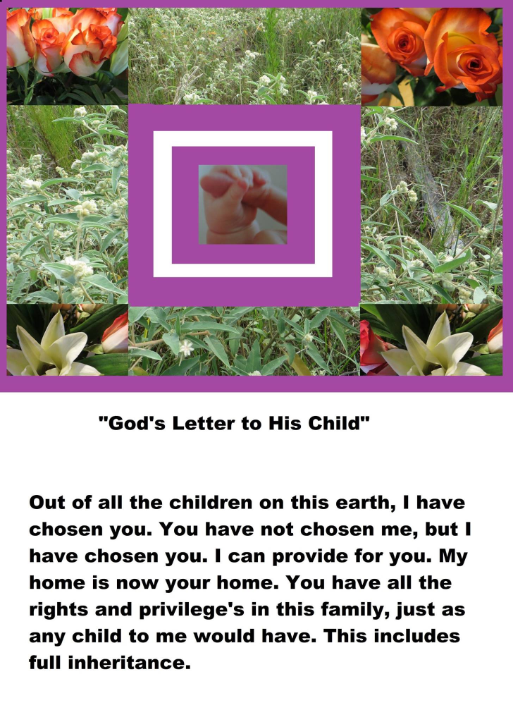 “God’s Letter to His Child” Out of all the children on this earth, Oh I have chosen you. You have not chosen me, but I have chosen you. I can provide for you. My home is now your home. You have all the rights and privileges in this family, just as any child to me would have. This includes full inheritance.