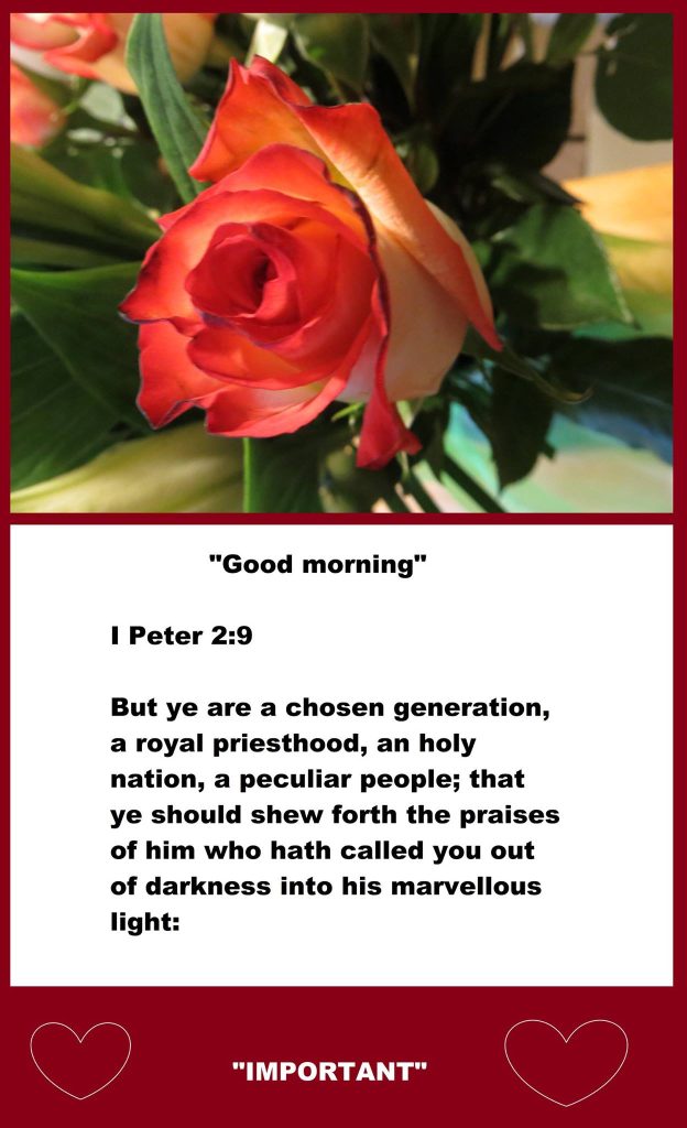 1 Peter 2:9: But ye are a chosen generation, a royal priesthood, a Holy Nation, a peculiar people; that ye should shew forth the praises of Him who hath called you out of darkness into His marvelous light: