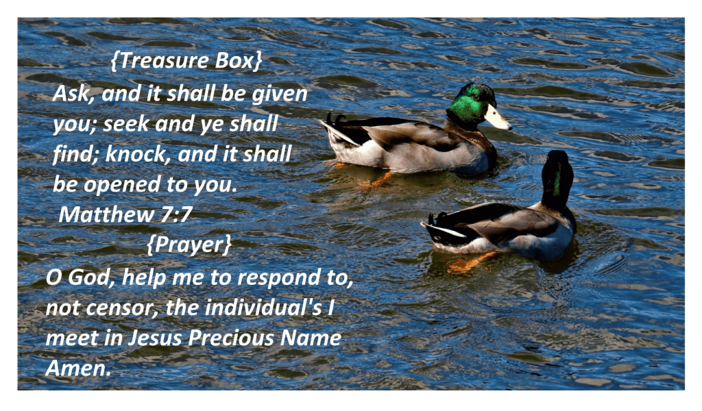 O God, help me to respond to, not censor, the individual’s I meet in Jesus Precious Name Amen.
