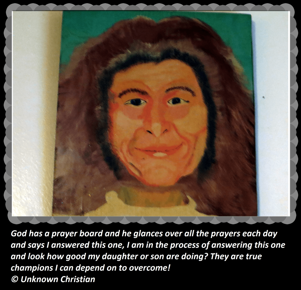 God has a prayer board, and he glances over all the prayers each day and says I answered this one, I am in the process of answering this one and look how good my daughter or son are doing? They are true champions I can depend on to overcome!
