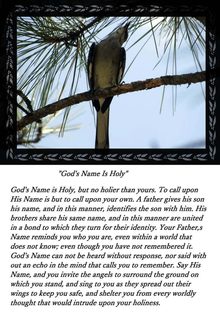 God’s Name is Holy, but no holier than yours. To call upon His Name is but to call upon your own. A father gives his son his name, and in this manner, identifies the son with him. His brothers share his same name, and in this manner are united in a bond to which they turn for their identity. Your Father’s Name reminds you who you are, even within a world that does not know; even though you have not remembered it. God’s Name cannot be heard without response, nor said without an echo in the mind that calls you to remember. Say His Name, and you invite the angels to surround the ground on which you stand and sing to you as they spread out their wings to keep you safe, and shelter you from every worldly thought that would intrude upon your holiness.