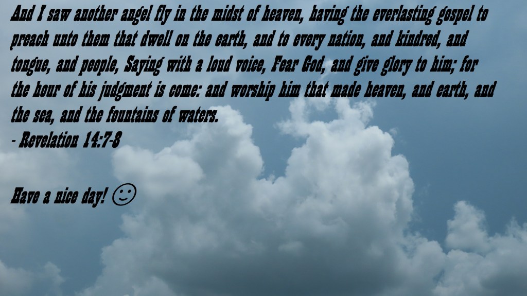 And I saw another angel fly in the midst of heaven, having the everlasting gospel to preach unto them that dwell on the earth, and to every nation, and kindred, and tongue, and people, Saying with a loud voice, Fear God, and give glory to him; for the hour of his judgment is come: and worship him that made heaven, and earth, and the sea, and the fountains of waters.