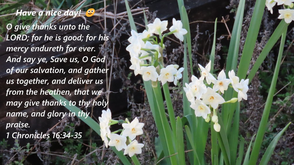 O give thanks unto the LORD; for he is good; for his mercy endureth for ever. And say ye, Save us, O God of our salvation, and gather us together, and deliver us from the heathen, that we may give thanks to thy holy name, and glory in thy praise.