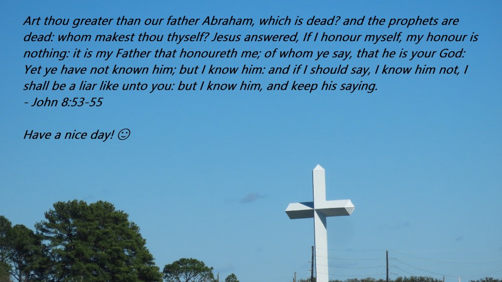 Art thou greater than our father Abraham, which is dead? and the prophets are dead: whom makest thou thyself? Jesus answered, If I honour myself, my honour is nothing: it is my Father that honoureth me; of whom ye say, that he is your God: Yet ye have not known him; but I know him: and if I should say, I know him not, I shall be a liar like unto you: but I know him, and keep his saying.