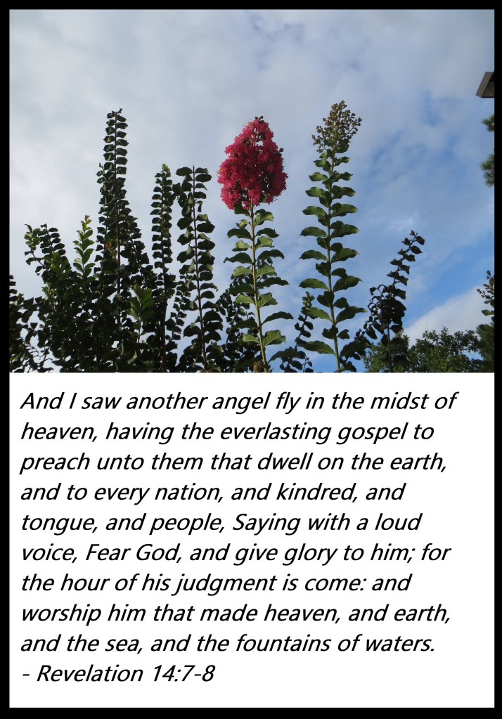 And I saw another angel fly in the midst of heaven, having the everlasting gospel to preach unto them that dwell on the earth, and to every nation, and kindred, and tongue, and people, Saying with a loud voice, Fear God, and give glory to him; for the hour of his judgment is come: and worship him that made heaven, and earth, and the sea, and the fountains of waters.