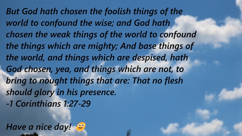 But God hath chosen the foolish things of the world to confound the wise; and God hath chosen the weak things of the world to confound the things which are mighty; And base things of the world, and things which are despised, hath God chosen, yea, and things which are not, to bring to nought things that are: That no flesh should glory in his presence.