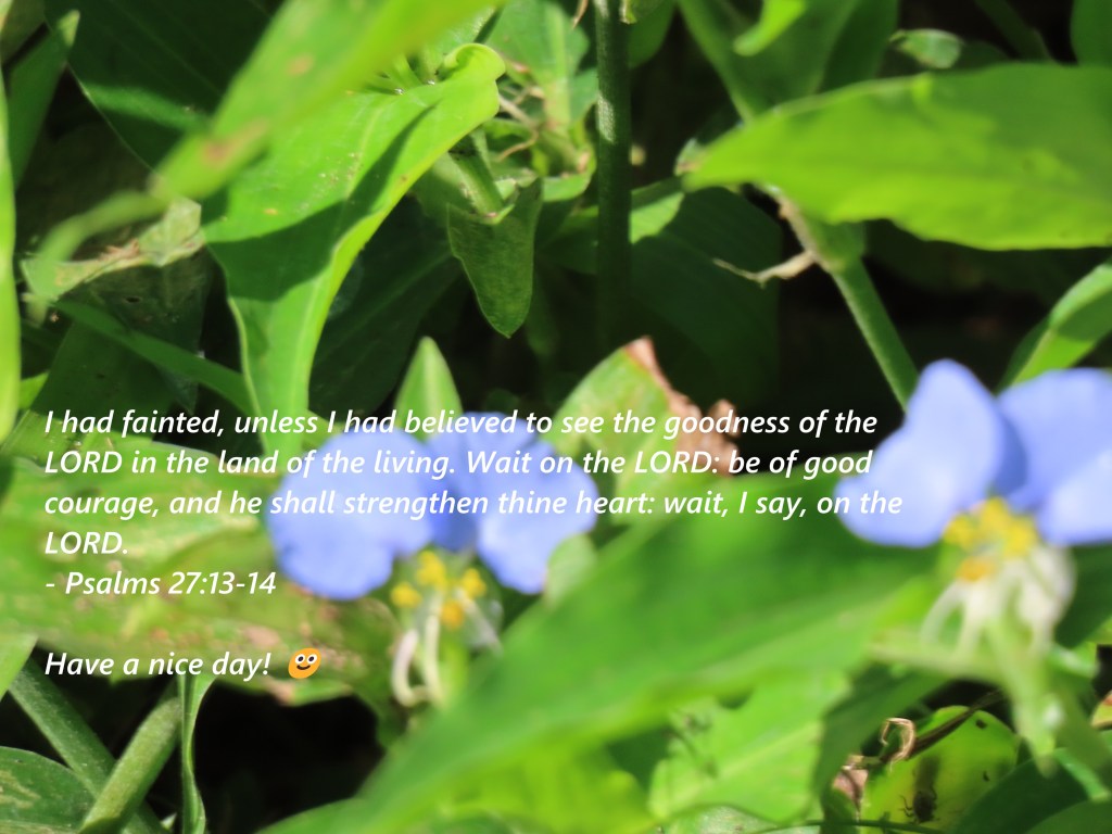 I had fainted, unless I had believed to see the goodness of the LORD in the land of the living. Wait on the LORD: be of good courage, and he shall strengthen thine heart: wait, I say, on the LORD.