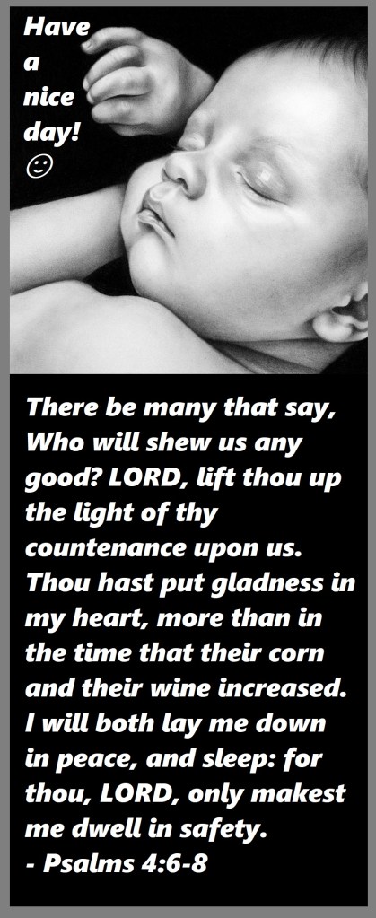 There be many that say, Who will shew us any good? LORD, lift thou up the light of thy countenance upon us. Thou hast put gladness in my heart, more than in the time that their corn and their wine increased. I will both lay me down in peace, and sleep: for thou, LORD, only makest me dwell in safety.