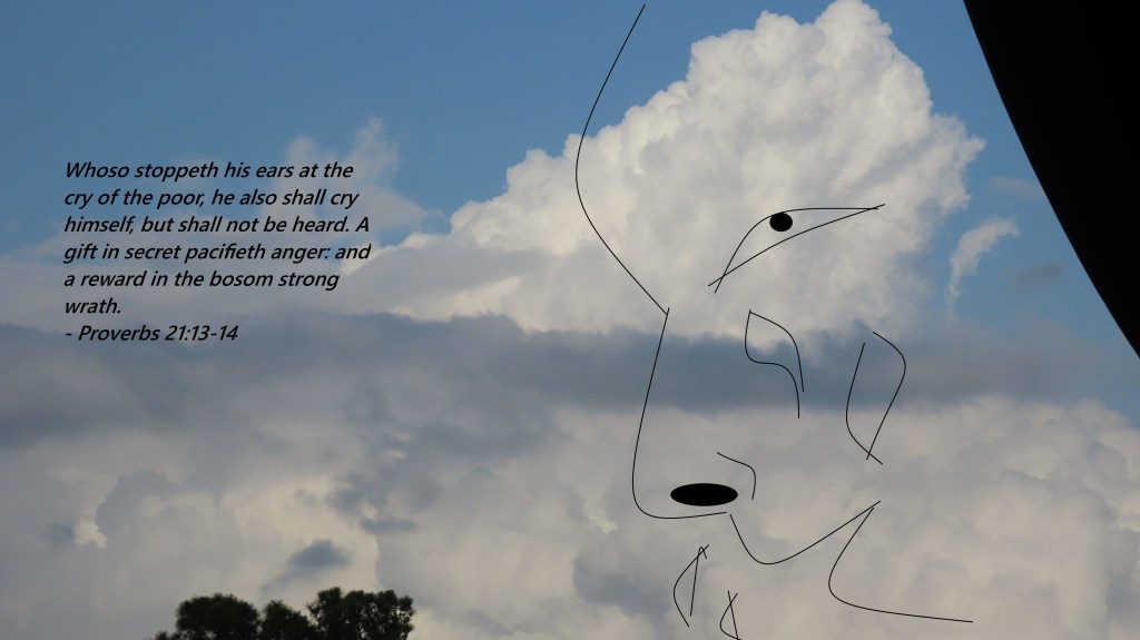 Whoso stoppeth his ears at the cry of the poor, he also shall cry himself, but shall not be heard. A gift in secret pacifieth anger: and a reward in the bosom strong wrath.