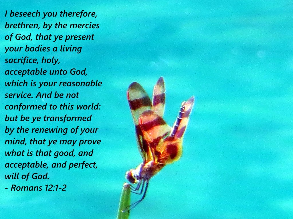 I beseech you therefore, brethren, by the mercies of God, that ye present your bodies a living sacrifice, holy, acceptable unto God, which is your reasonable service. And be not conformed to this world: but be ye transformed by the renewing of your mind, that ye may prove what is that good, and acceptable, and perfect, will of God.
